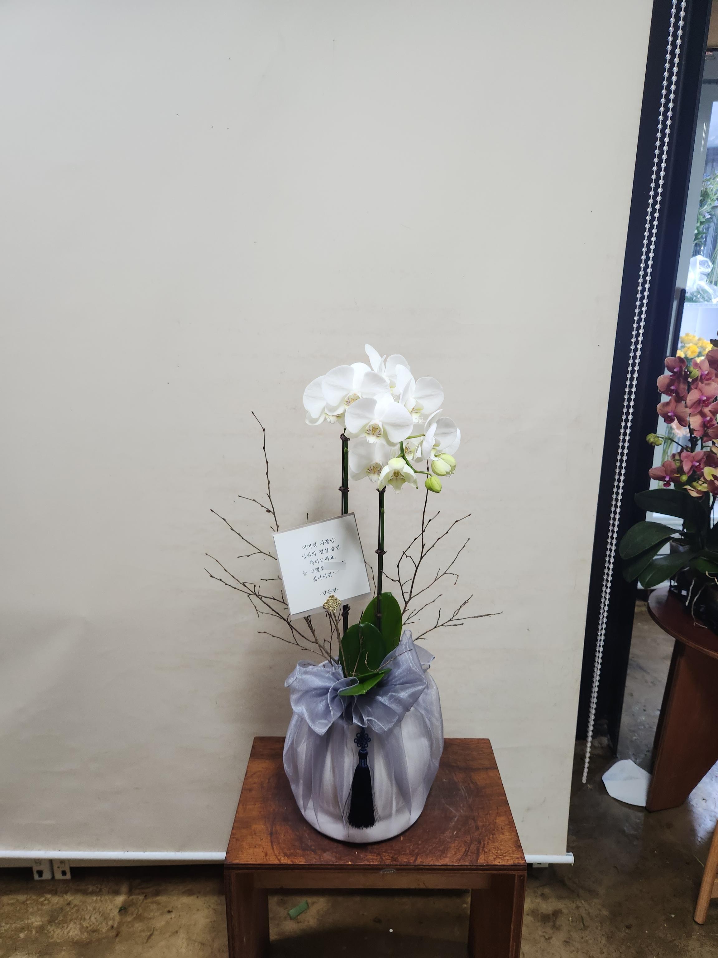 화이트 호접란 서양난 승진 영전 축하난 부모님 선물 꽃배달 개업화분 오픈 사무실이전 카페호접 화이트(2대)-줄무늬 화이트+화이트 보자기