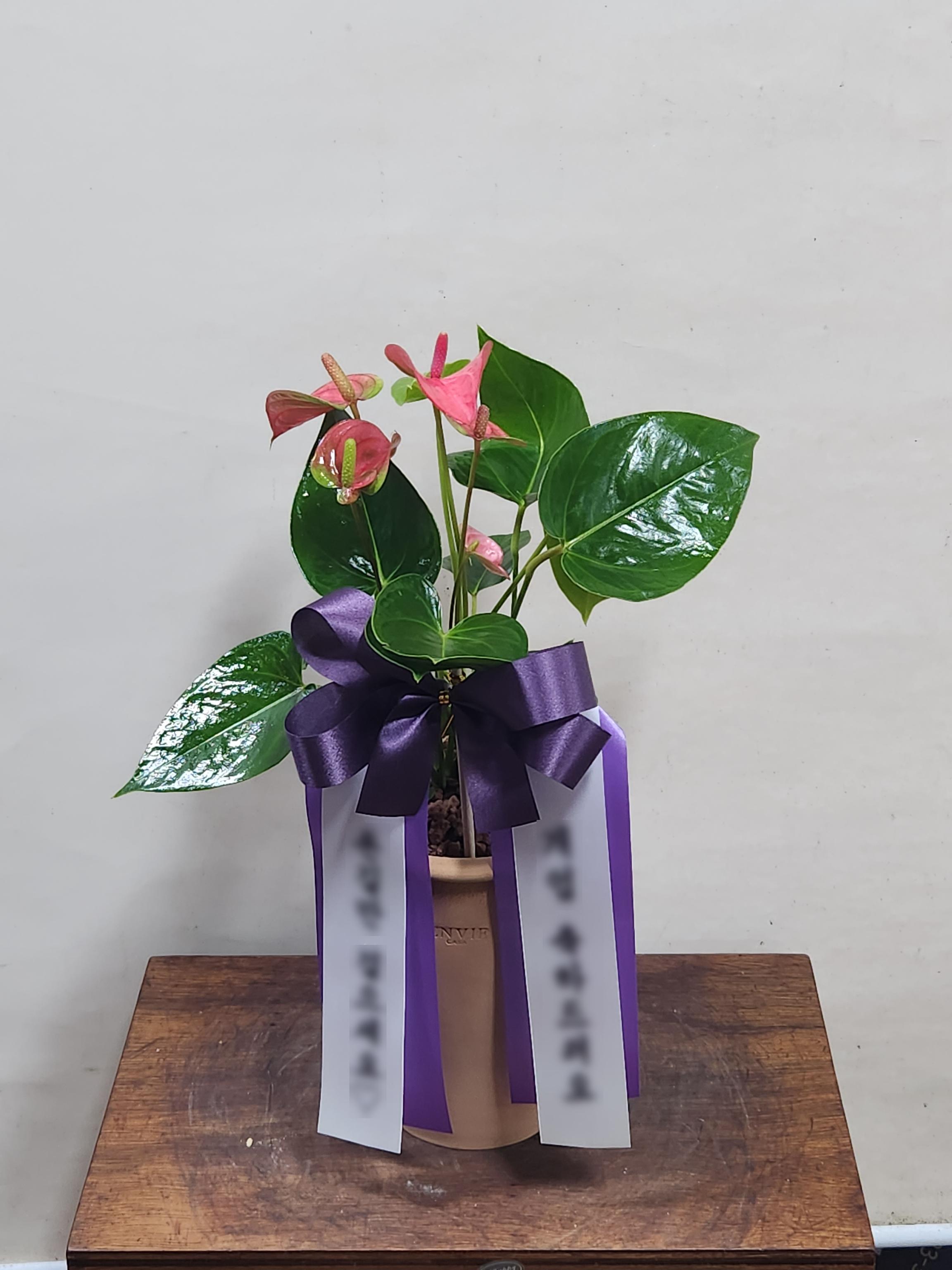 개업화분 중형 테이블 금전수 개업축하 오픈 사무실이전 카페 식당 꽃배달분홍 안스리움-토분 롱팟 베이지