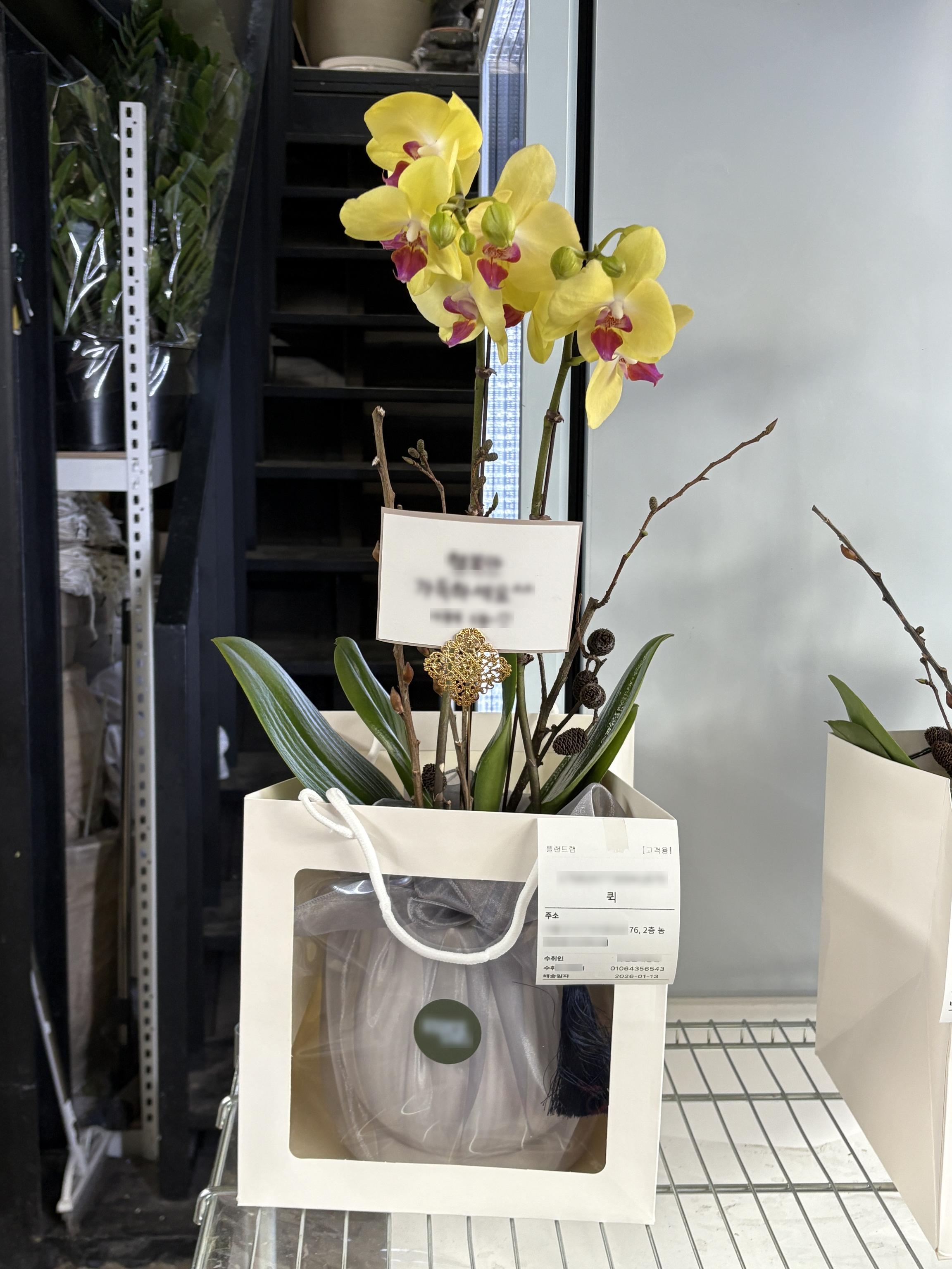 승진 영전 축하난 호접란 부모님 선물 꽃배달 개업화분 문구 오픈 사무실이전 카페호접 노랑색(2대)-줄무늬 화이트+그레이 보자기